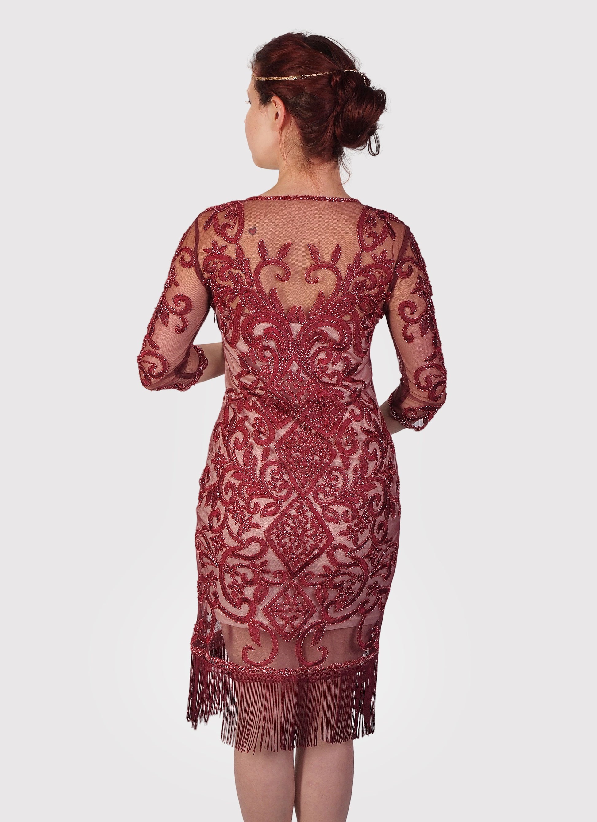 Look, fabulous in our merlot embroidered fringe flapper dress channel the great gatsby on your night out on the town.