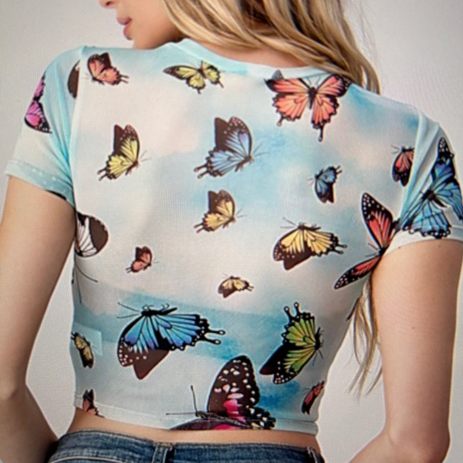 Feel oh soo fly (pun intended) in this sheer beautiful butterfly top. Pair it with jeans, shorts or as a swimsuit coverup. The colorful butterflies add to any outfit. Perfect for a festival, date night, or whatever your heart desires. Available with a sky blue cloud detail background or a white sheer background. Comes in multiple sizes.